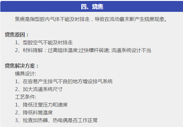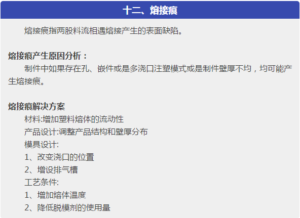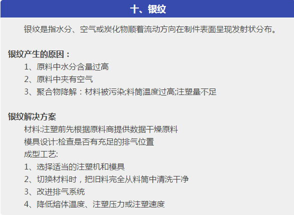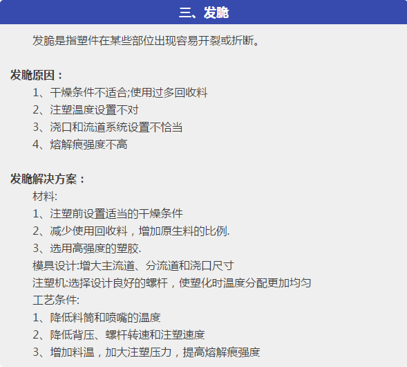本文針對塑件在成型過程中出現(xiàn)的各種注塑缺陷,主要是:短射,困氣,發(fā)脆,燒焦,飛邊,分層起皮,噴流痕,流痕,霧斑(澆口暈),銀紋(水花紋),凹痕,熔接痕,成型周期過長,翹曲變形,分析了問題產(chǎn)生的可能原因,從原材料、塑件或模具設(shè)計、成型工藝等各方面,提出解決方案。