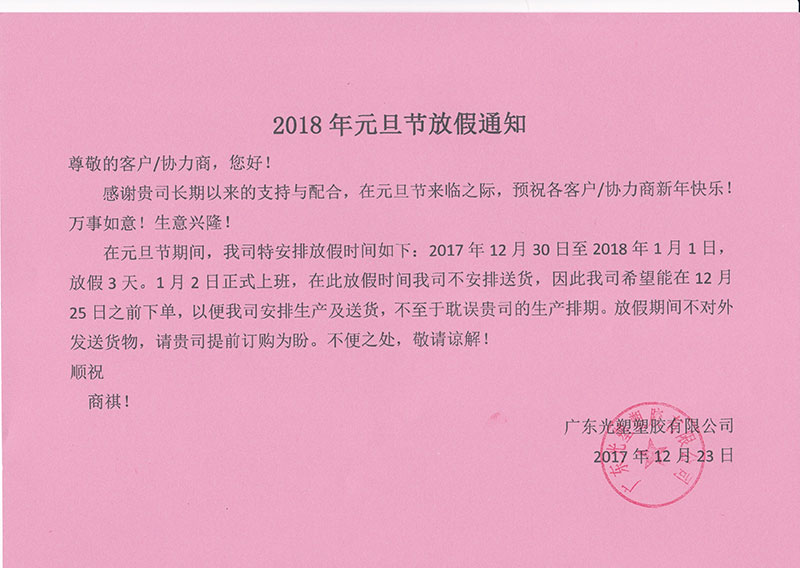 在元旦節(jié)期間,我司特安排放假時(shí)間如下:2017年12月30日至2018年1月1日,放假3天。1月2日正式上班,在此放假時(shí)間我司不安排送貨,因此我司希望能在12月25日之前下單,以便我司安排生產(chǎn)及送貨,不至于耽誤貴司的生產(chǎn)排期。放假期間不對(duì)外發(fā)送貨物,請(qǐng)貴司提前訂購(gòu)為盼。不便之處,敬請(qǐng)諒解!