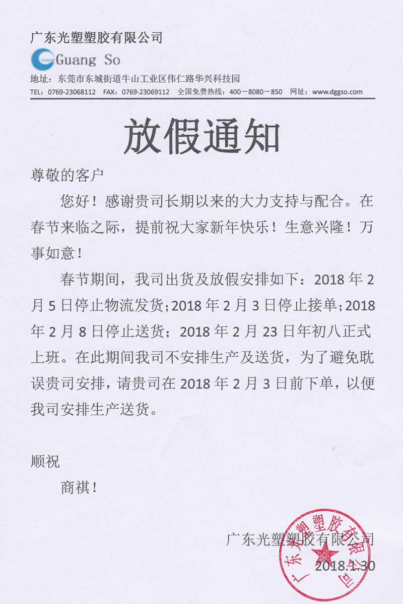 您好!以下是我司春節(jié)期間放假通知及安排。在春節(jié)來(lái)臨之際,提前祝福大家現(xiàn)年快樂(lè)!生意興??!萬(wàn)事如意!