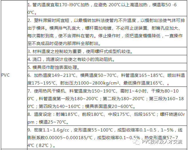 聚氯乙烯原料會輕微吸水,生產(chǎn)時必須干燥。PVC沒有明顯的熔點(diǎn),PVC在成型過程中易釋放出有毒氣體,因此,需要加入大量的熱穩(wěn)定劑才能注塑。材料的成型需盡可能地用較低的溫度注射,同時亦應(yīng)盡可能縮短啤塑周期,以減少熔料在料筒內(nèi)的滯留時間。PVC在料筒內(nèi)長時間受熱,會使膠體變黃甚至產(chǎn)生黑點(diǎn),并且氯化氫對模腔有腐蝕作用,所以要經(jīng)常清洗模腔及機(jī)頭死角位。模具溫度盡可能低,縮短成型周期以及減小膠體件。塑模的澆口、流道盡可能粗、短、厚,以減少壓力損失使料流盡快充滿型腔,宜采用高壓低溫。