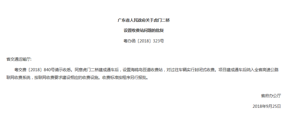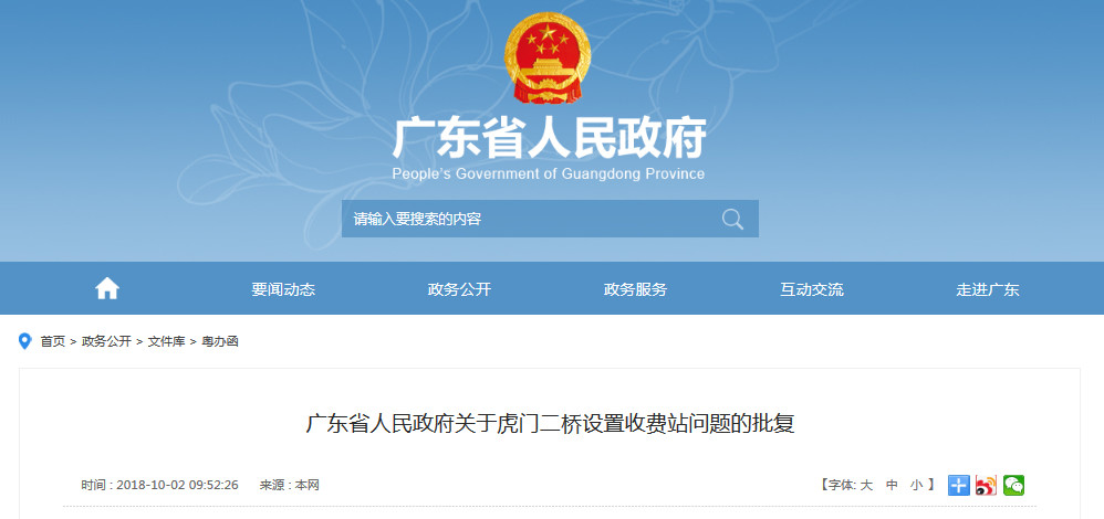 10月2日,即在國慶節(jié)假日期間,廣東省人民政府門戶網(wǎng)站加班加點(diǎn)發(fā)布重磅公告,即有關(guān)虎門二橋設(shè)置收費(fèi)站問題已獲省府批復(fù),為明年虎門二橋的開通前期準(zhǔn)備工作全面加速同步推進(jìn),預(yù)計(jì)虎門二橋?qū)⒂诿髂晟习肽杲ǔ赏ㄜ?,通車后打通珠江兩岸交通瓶頸,極大緩解目前虎門大橋的擁堵狀況。