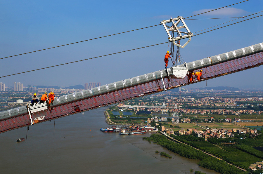 在大沙水道,193米高的東塔從江面直沖云霄。項(xiàng)目施工方相關(guān)負(fù)責(zé)人介紹:“主塔共分41節(jié),每節(jié)精度誤差不超過10毫米。受廣東炎熱天氣的影響,測(cè)量監(jiān)控和混凝土澆筑一般都在晚上進(jìn)行。”如果把橋梁比作一桿秤,錨碇就相當(dāng)于秤砣,橋梁的荷載主要由橋兩端的秤砣來承受。在東錨碇施工中,施工方用了5900噸鋼筋,混凝土澆筑方量18.6萬方,相當(dāng)于62個(gè)標(biāo)準(zhǔn)游泳池,重量達(dá)到46.5萬噸,經(jīng)過無數(shù)次的模板搭建和澆筑才完成。
