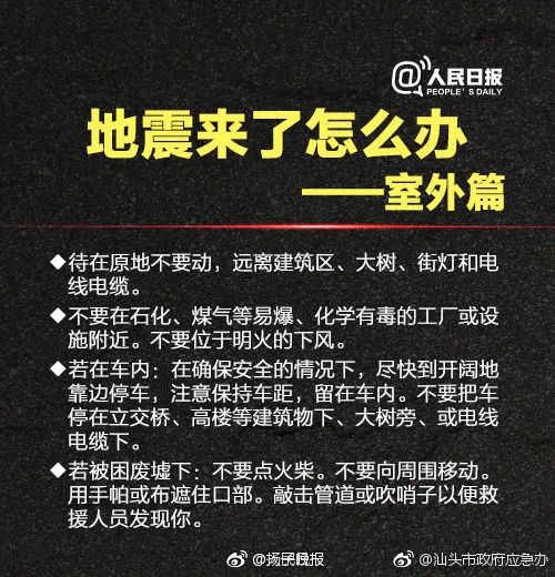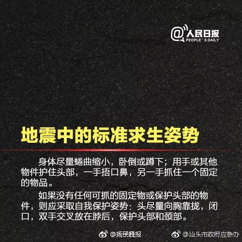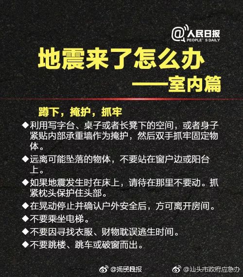 人民日報發(fā)布的《最權(quán)威地震逃生手冊》,當(dāng)?shù)卣鸢l(fā)生時,如果您在床上,應(yīng)該待在那里不要動,抓緊枕頭保護(hù)頭部;如果您在室內(nèi)應(yīng)該利用承重墻為掩護(hù),雙手抓牢固定物體。如果您在室外,應(yīng)遠(yuǎn)離建筑區(qū)、大樹、街燈和電線電纜。