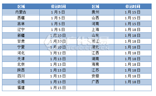 內(nèi)蒙古,西藏,吉林,遼寧等地1月5日停運,新疆,甘肅,寧夏等地1月10日停運。河北1月12日停運,天津,北京,陜西,四川,云南等地1月13日停運。福建,貴州,山西,河南等地1月15日停運。上海,山東,浙江,湖北,江西,湖南,海南,江蘇,安徽,廣西等地1月18日停運。