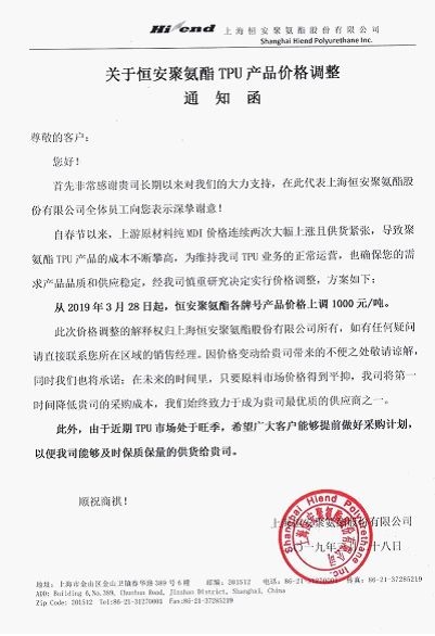 目前聚氨酯TPU等產(chǎn)品也因成本攀升,有了跟漲效應(yīng),上海恒安聚氨酯股份有限公司日前發(fā)布《通知函》稱:自春節(jié)以來(lái),上游原材料純MDI價(jià)格連續(xù)兩次大幅上漲且供貨緊張,導(dǎo)致聚氨酯TPU產(chǎn)品的成本不斷攀高,為維持公司正常運(yùn)營(yíng),也確保下游供貨穩(wěn)定,從2019年3月28日起,恒安聚氨酯各牌號(hào)產(chǎn)品價(jià)格上調(diào)1000元/噸。