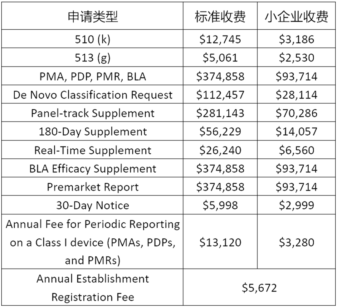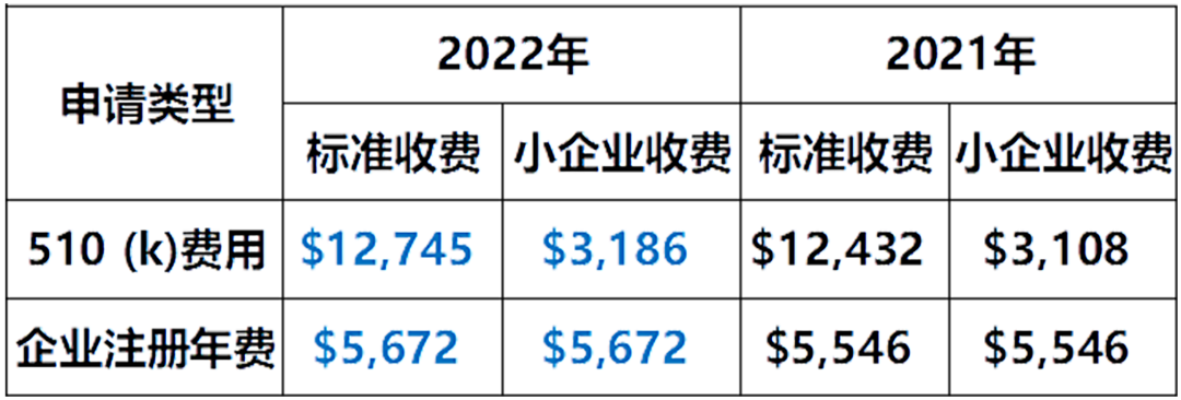 2021年8月2日,美國FDA關(guān)于2022年的收費(fèi)標(biāo)準(zhǔn)已正式公布。其中FDA企業(yè)注冊和器械列名的年費(fèi)和510(K) 申報費(fèi)用對中國的制造商影響比較大,這兩項費(fèi)用都略有提高。